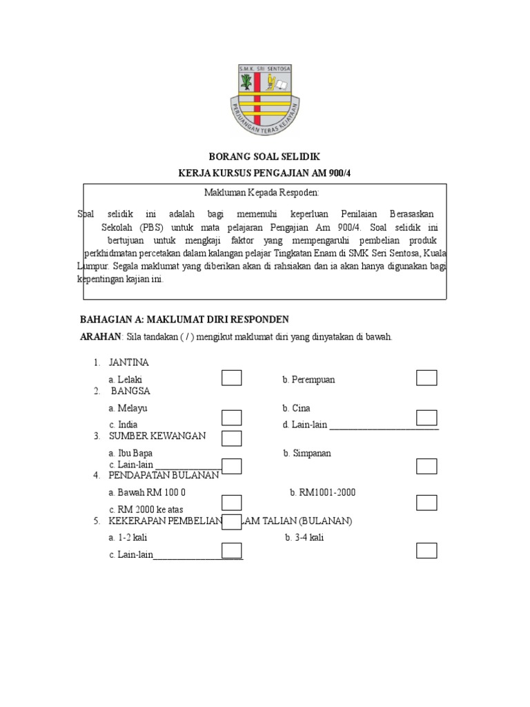 Doc Borang Soal Selidik Kerja Kursus Pengajian Am Kod Mata Pelajaran 900 4 Nurul Farhana Academia Edu